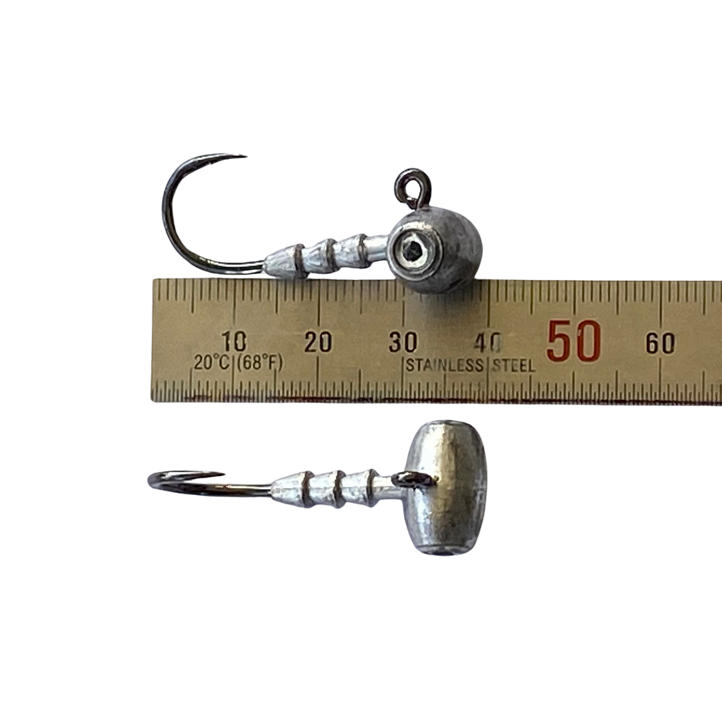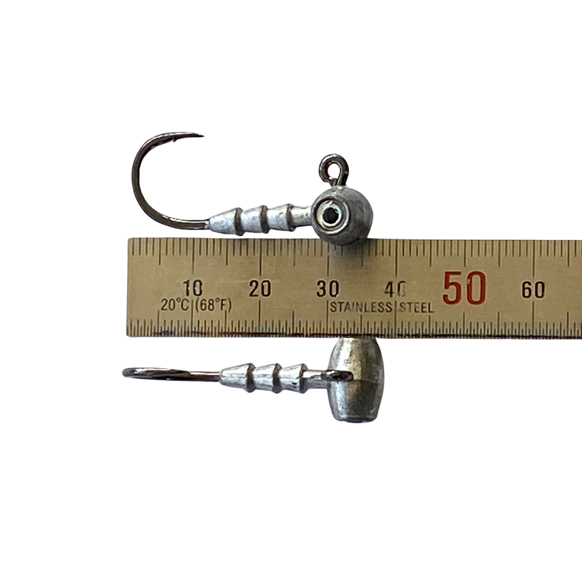 Hammer Headz Jig Heads feature a robust 1.57mm wire diameter, providing superior strength in a compact design. The ultra sharp, chemically sharpened hooks ensure secure penetration, while their anti corrosion finish offers long lasting durability for saltwater fishing. These versatile small jig heads include secure lure attachment lugs and a sleek barrel shaped head to maximize the natural movement of your lures.